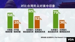 虽然根据《台湾关系法》,华盛顿与台北之间的关系属于非官方性质,不过皮尤研究中心的数据显示,台湾民意不但强烈支持与美国发展经贸关系(85%),而且也强烈支持与美国强化政治关系(79%)。当被问到美国国会近来通过一连串友台法案,进一步强化美台双边关系,是不是促使台湾民众对美国抱持好感的原因之一,谭妲表示:“我们在调查时并未询问台湾民众对特定政策或法案的看法,但我们从数据中的确能看出,台湾民众对美国具有非常高的好感与支持度,在每个年龄段都至少有平均七成的台湾民众支持与美国加强经贸与政治关系,如果只问好感度的话,在每一组年龄段的数据中也能看到大多数的台湾民众对美国抱持正面观感,虽然单靠这些观感的数据不一定有助于分析特定的政策,但我们非常确定的是,台湾民众对美台关系的强烈支持是跨越人口结构的。”