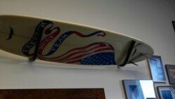 来到罗拉巴克众议员办公室首先看到的是墙上挂满了冲浪板,因为罗拉巴克众议员是冲浪好手。
